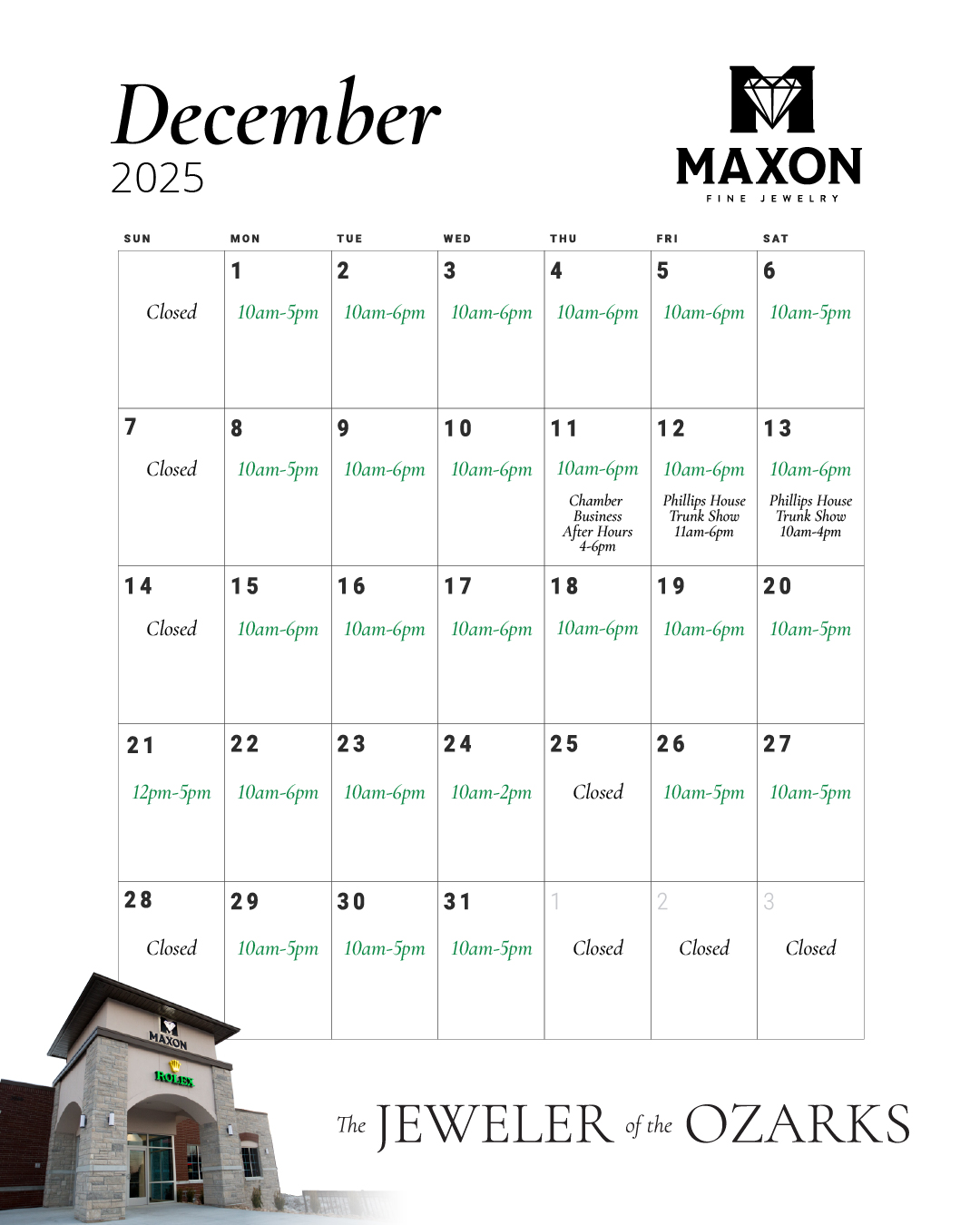 At Maxon, we take great pride in offering exquisite jewelry and luxury watches. Our diamonds, vintage estate pieces, and fine jewelry are meticulously handled by our certified gemologists, ensuring the highest quality in every item we sell. Their expertise guarantees not only the excellence of our pieces but also the precision of our repairs and appraisals. With a bench jeweler on staff who has over 35 years of experience, you can trust that our knowledge of fine jewelry is backed by a deep well of expertise, making us the definitive Jeweler of the Ozarks.