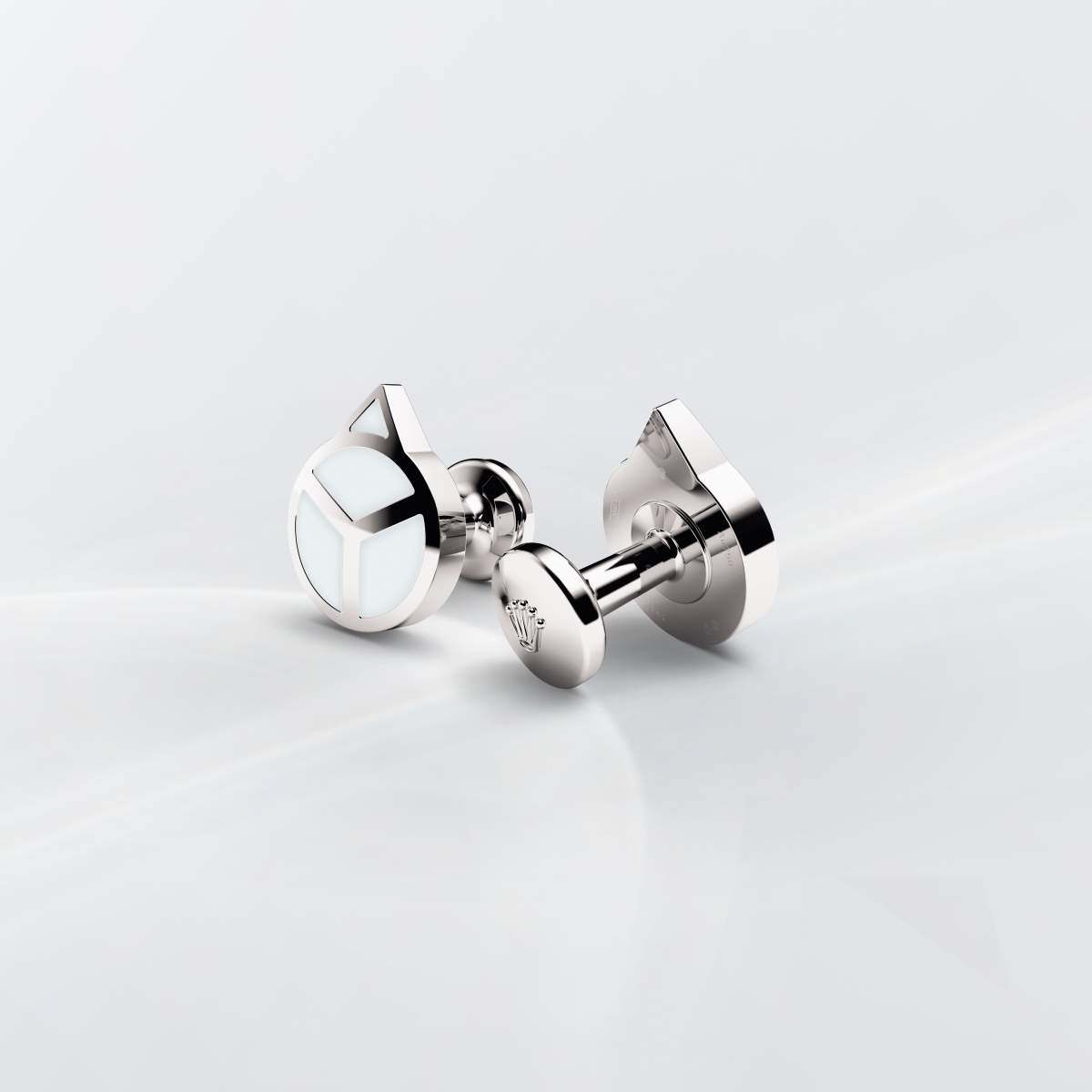Rolex cufflinks made of 18 kt white gold that echo the hour hand found on Professional Rolex watches, equipped with a Chromalight display.