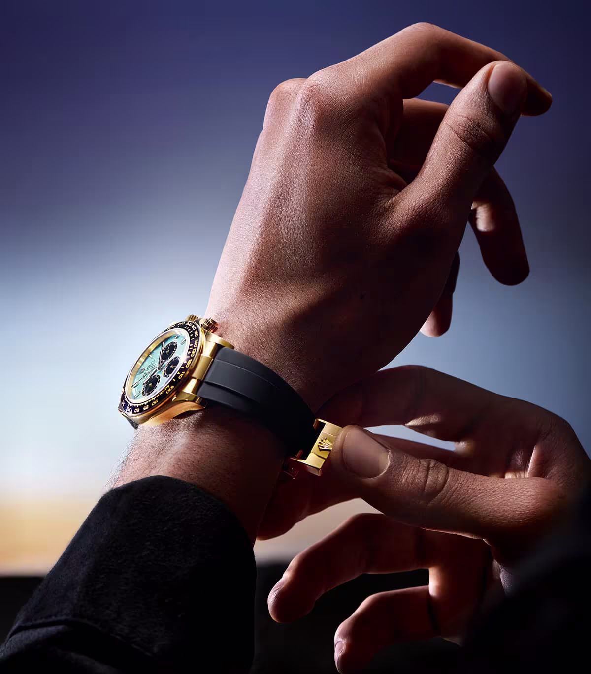 The Cosmograph Daytona with turquoise blue lacquer dial and bright black counters is fitted on an Oysterflex bracelet. Developed by Rolex and patented, this bracelet is made up of two flexible, curved metal blades – one for each of the sections – overmolded with high-performance black elastomer.