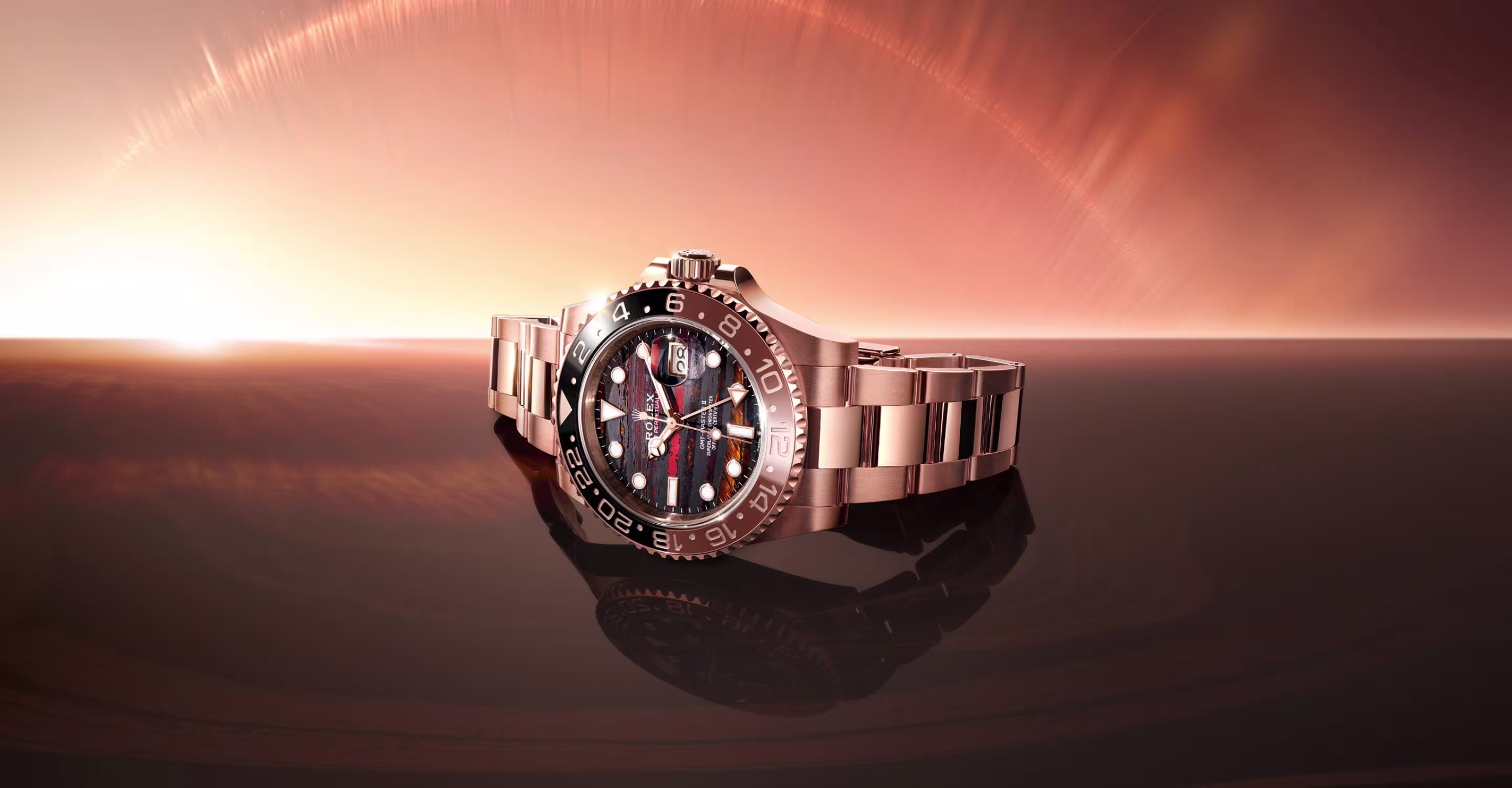 The GMT‑Master II with dial in tiger iron is mounted on an Oyster bracelet. Developed in the late 1930s, this three-piece link metal bracelet is known for its robustness.