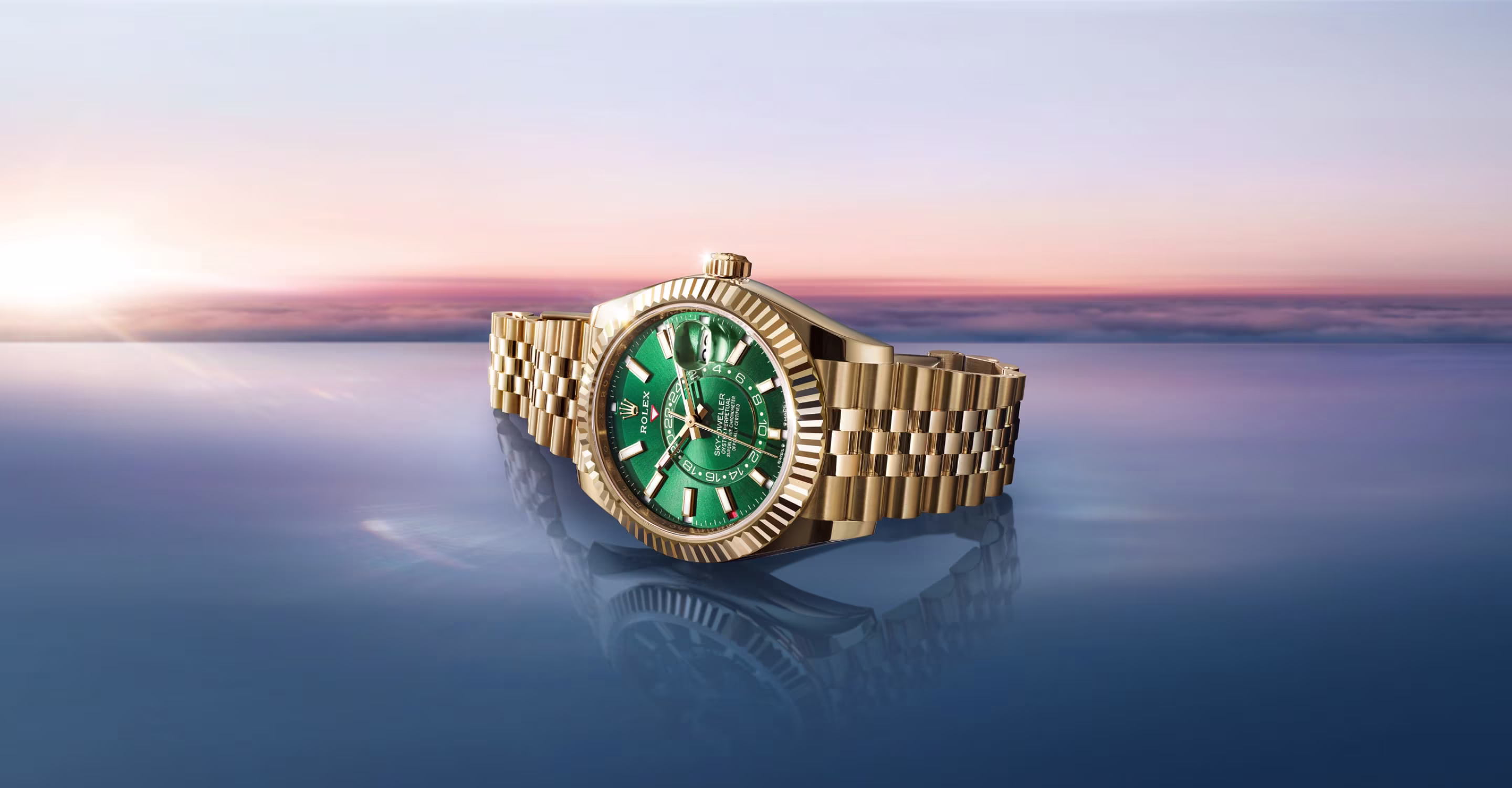 The fluted bezel of the Sky‑Dweller with bright green dial is fashioned from 18 kt yellow gold – the same material as its Oyster case and Jubilee bracelet.