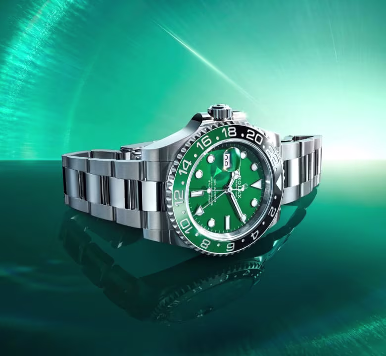The GMT‑Master II is driven by caliber 3285, a movement at the forefront of watchmaking technology, enabling it to display the date and an additional time zone in 24-hour format, as well as the hours, minutes and seconds.