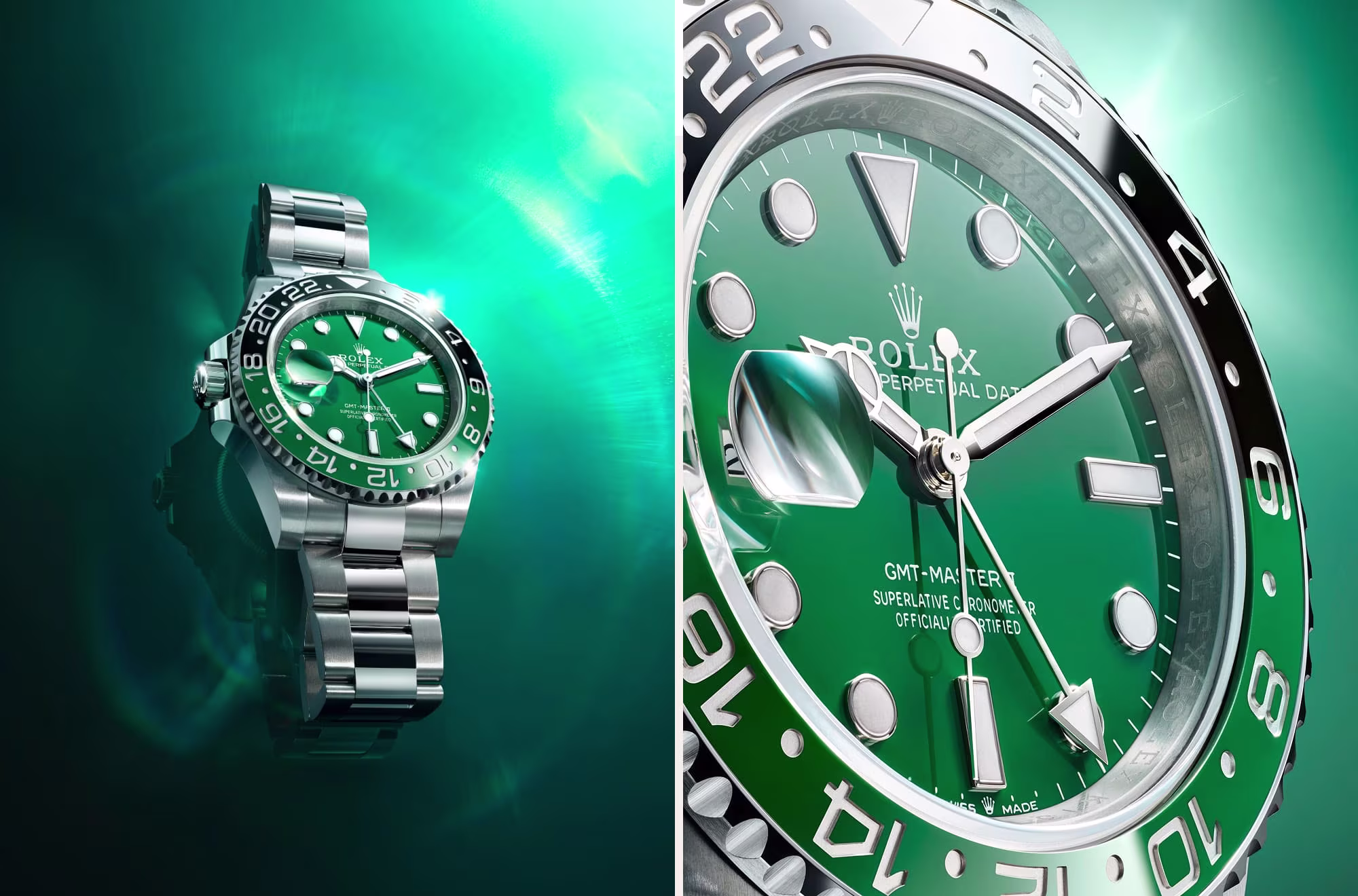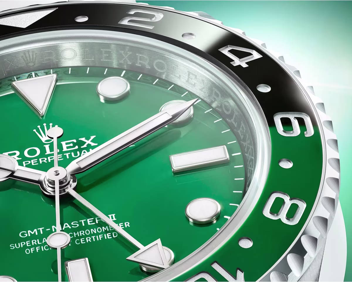 This inaugural green Cerachrom component makes its debut on an Oyster Perpetual GMT‑Master II with winding crown on the left side of the case and date aperture at 9 o’clock, a version which additionally, this year, is presented in 18 kt white gold.