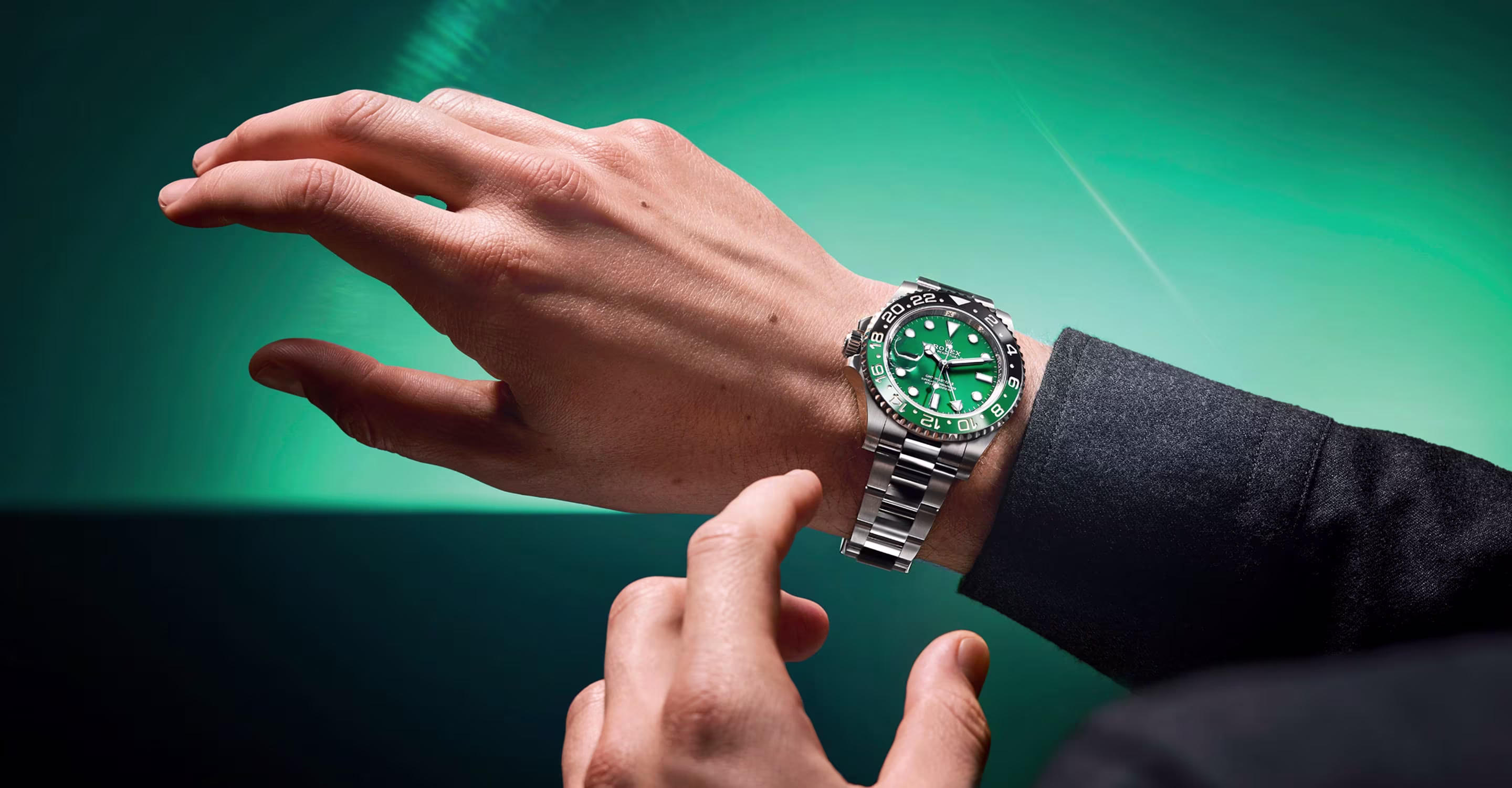 This new version of the GMT‑Master II is mounted on an Oyster bracelet equipped with an Oysterlock safety clasp.
