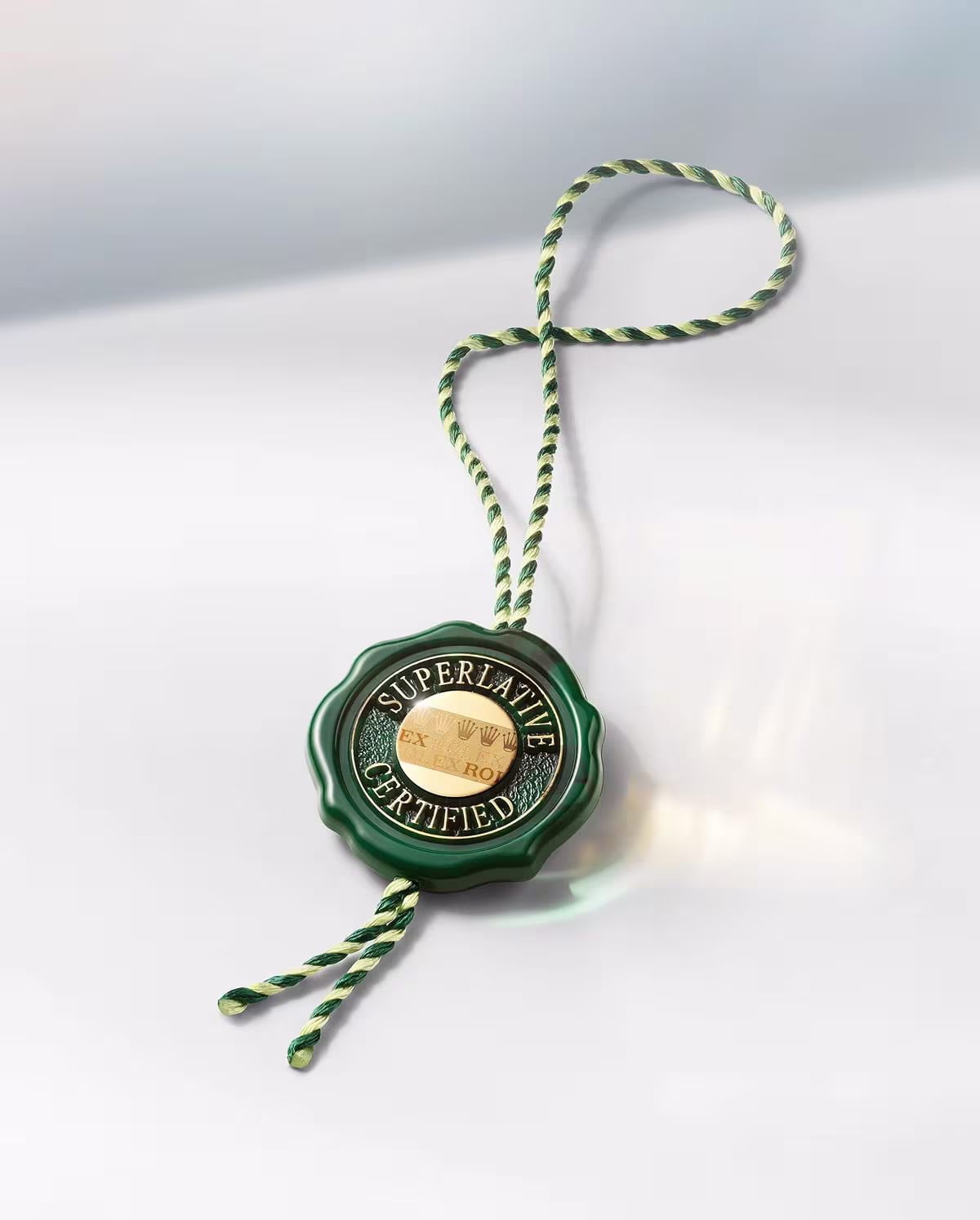 The Superlative Chronometer status is symbolized by the green seal that comes with every Rolex watch and is coupled with an international five-year guarantee.