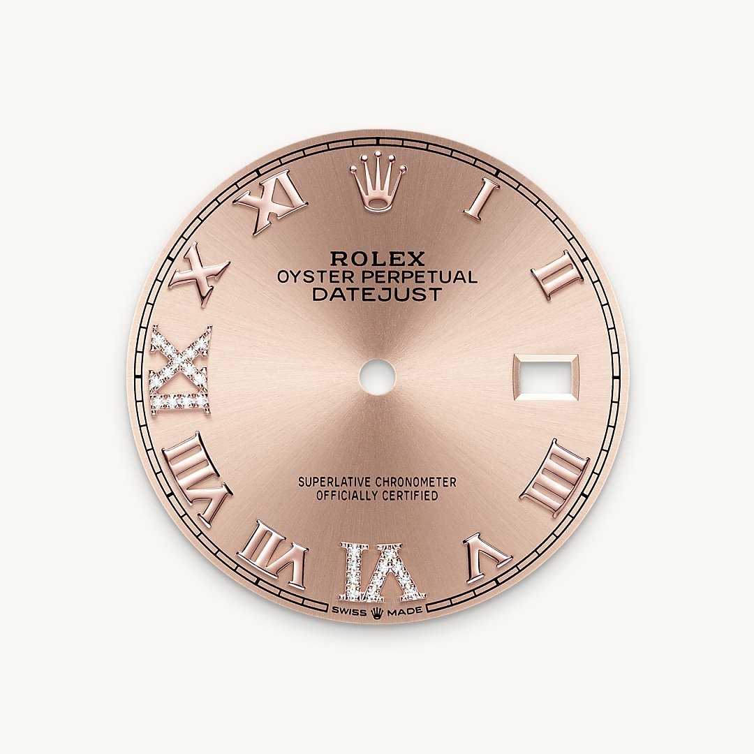 This dial features a Roman VI and IX in 18 ct gold, set with 24 diamonds. The sunray finish creates delicate light reflections on many dials in the Oyster Perpetual collection. It is obtained using masterful brushing techniques that create grooves running outwards from the centre of the dial. Light is diffused consistently along each engraving, creating a characteristic subtle glow that moves depending on the position of the wrist. Once the sunray finish has been completed, the dial colour is applied using Physical Vapour Deposition or electroplating. A light coat of varnish gives the dial its final look.