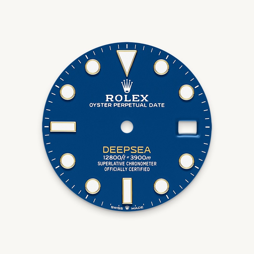 The 60-minute graduated, unidirectional rotatable bezel of the Rolex Deepsea enables divers to precisely and safely monitor their dive and decompression times. The triangular ‘zero’ marker of the graduation is visible in the dark thanks to an embedded capsule containing a luminescent material emitting a long-lasting blue glow. The graduation on the bezel is coated via PVD (Physical Vapour Deposition) with a thin layer of yellow gold. The blues found in the compression ring, the dial and the Cerachrom bezel insert combine to create a subtle oceanic palette that is accentuated by the 18 ct yellow gold of the case and the Oyster bracelet.