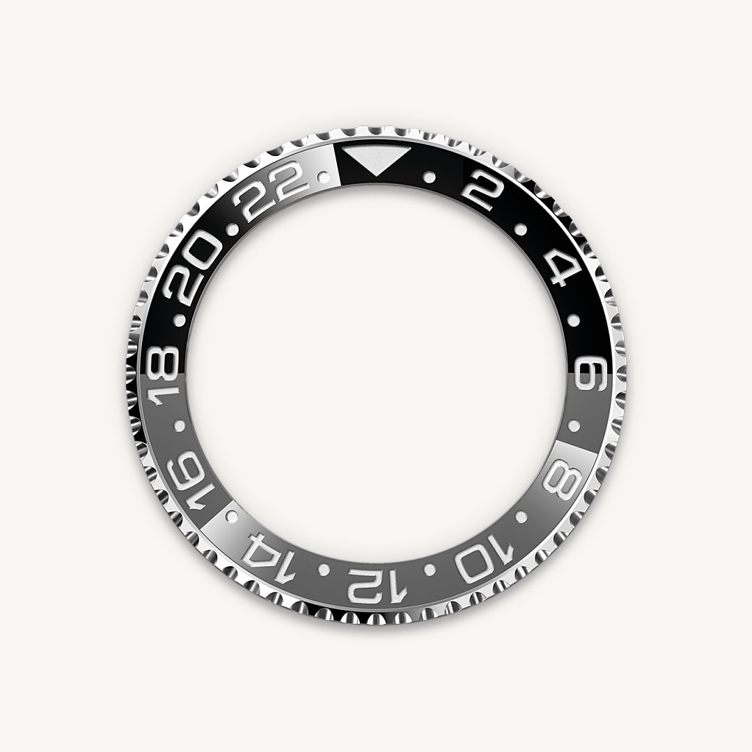 Bidirectional rotatable 24-hour graduated bezel. Two-colour grey and black Cerachrom insert in ceramic, moulded numerals and graduations