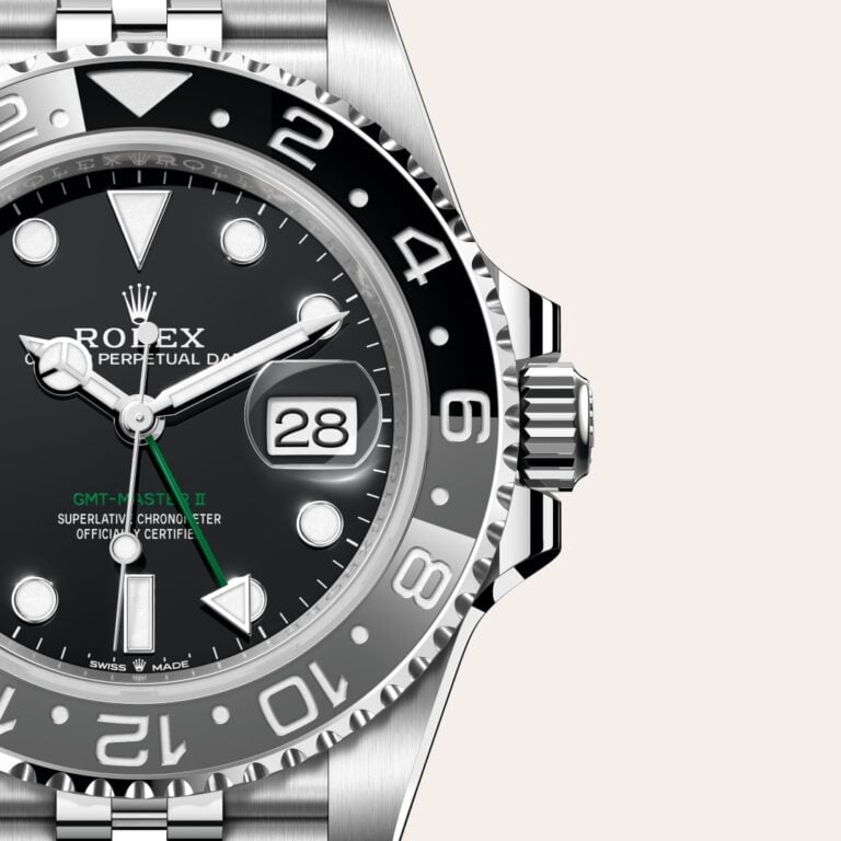 This model features a black dial and a two-colour Cerachrom bezel insert in grey and black ceramic. In addition to conventional hour, minute and seconds hands, the GMT-Master II features an arrow-tipped hand, which circles the dial once every 24 hours, as well as a bidirectional rotatable 24-hour graduated bezel. The distinctively coloured 24-hour hand displays the “home” reference time in a first time zone which can be read on the graduations on the bezel. The traveller’s local time is easily set by “jumping” from hour to hour, thanks to an ingenious mechanism operated via the winding crown: the hour hand can be adjusted forwards or backwards independently of the minute and seconds hands. This allows travellers to adapt to their new time zone without affecting the precision of their timekeeping.