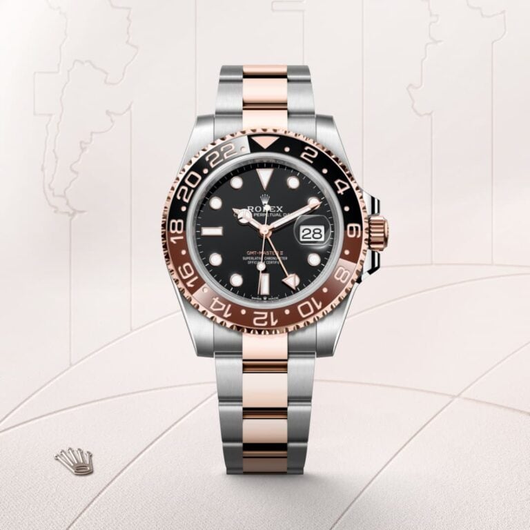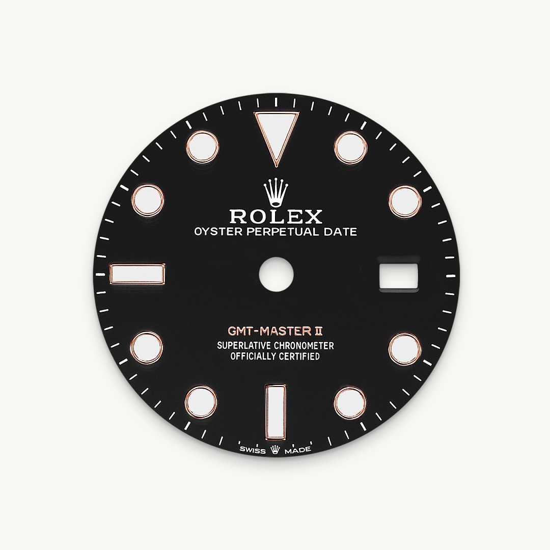 This model features a black dial and a two-colour Cerachrom bezel insert in brown and black ceramic. In addition to conventional hour, minute and seconds hands, the GMT-Master II features an arrow-tipped hand, which circles the dial once every 24 hours, as well as a bidirectional rotatable 24-hour graduated bezel. The distinctively coloured 24-hour hand displays the “home” reference time in a first time zone which can be read on the graduations on the bezel. The traveller’s local time is easily set by “jumping” from hour to hour, thanks to an ingenious mechanism operated via the winding crown: the hour hand can be adjusted forwards or backwards independently of the minute and seconds hands. This allows travellers to adapt to their new time zone without affecting the precision of their timekeeping.