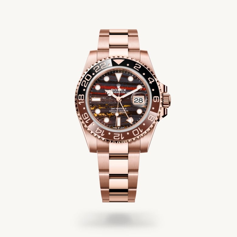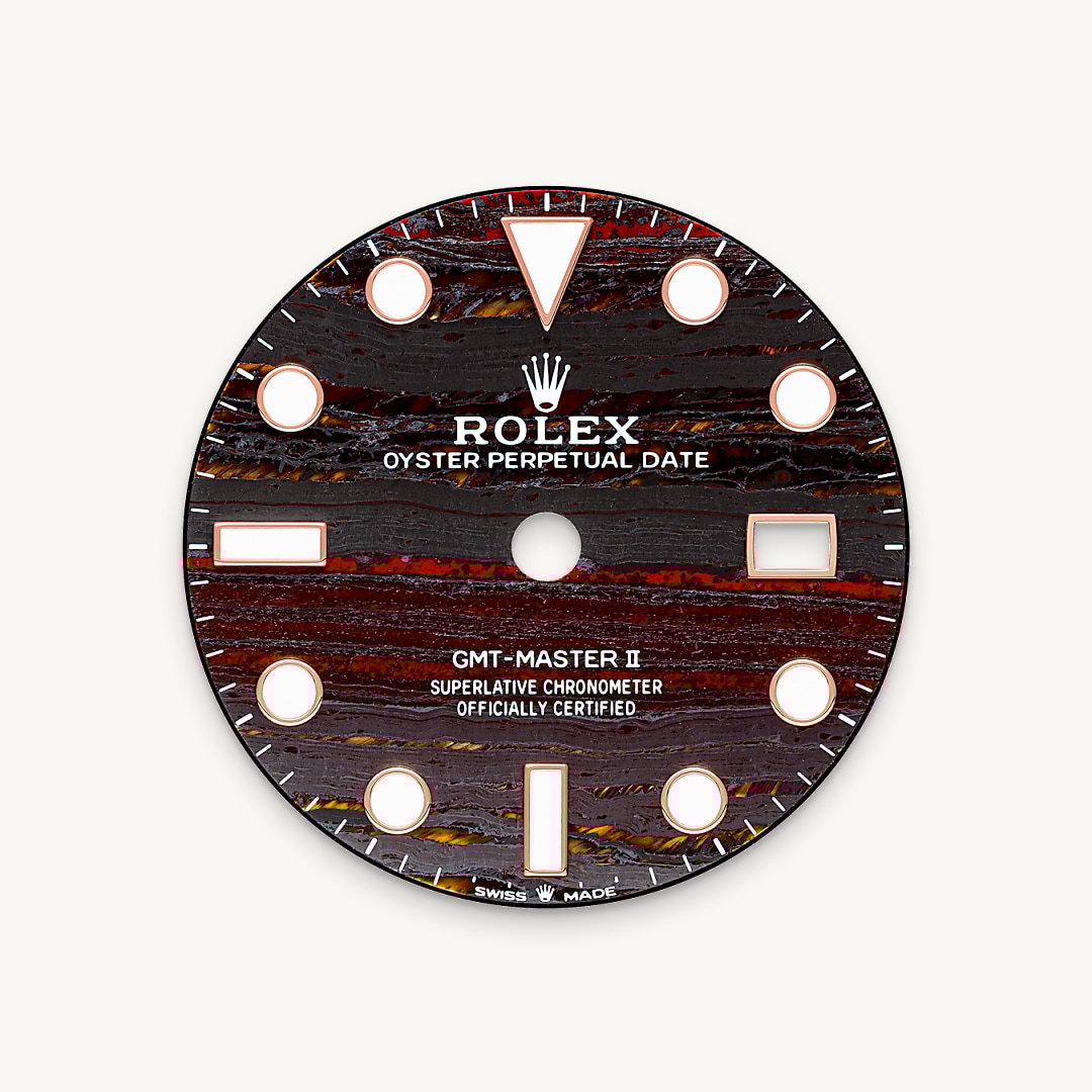 This GMT-Master II features a dial in tiger iron. This metamorphic rock, used by Rolex for the first time on this watch, is characterized by its complex structure. Composed of three minerals – tiger’s eye, red jasper and silvery hematite – it is a stone that pulses with golden and orangey tints, which, following painstaking selection and meticulous assembly, marry harmoniously with the colours of the case and bracelet.