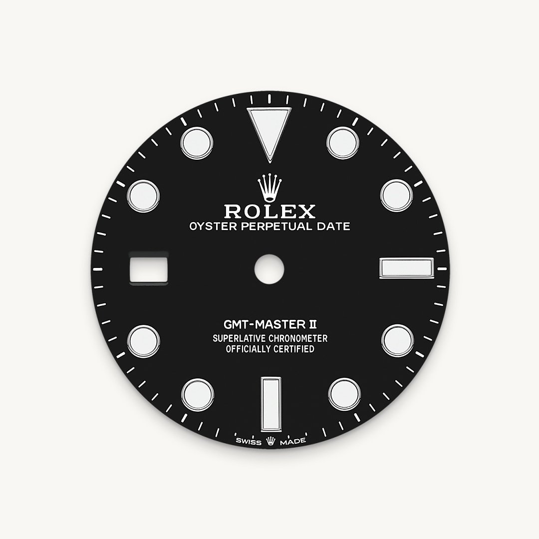 Like all Rolex Professional watches, the GMT-Master II offers exceptional legibility in all circumstances, and especially in the dark, thanks to its Chromalight display. The broad hands and hour markers in simple shapes – triangles, circles, rectangles – are filled with a luminescent material emitting a long-lasting glow. On this novel version of the watch, the crown and crown guard are on the left side of the watch case. The date aperture and the Cyclops lens are at 9 o’clock.