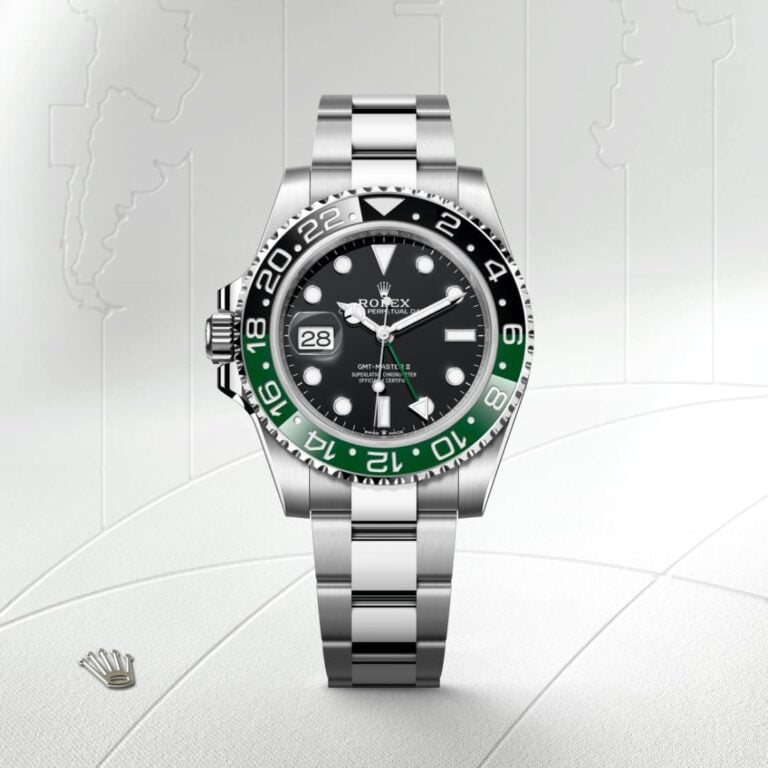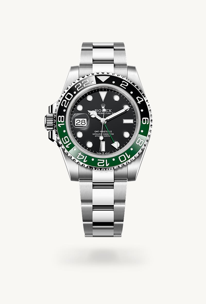 This model features a black dial and a two-colour Cerachrom bezel insert in green and black ceramic. In addition to conventional hour, minute and seconds hands, the GMT-Master II features an arrow-tipped hand, which circles the dial once every 24 hours, as well as a bidirectional rotatable 24-hour graduated bezel. The distinctively coloured 24-hour hand displays the “home” reference time in a first time zone which can be read on the graduations on the bezel. The traveller’s local time is easily set by “jumping” from hour to hour, thanks to an ingenious mechanism operated via the winding crown: the hour hand can be adjusted forwards or backwards independently of the minute and seconds hands. This allows travellers to adapt to their new time zone without affecting the precision of their timekeeping. The Cerachrom bezel insert features an original colour combination: black and an exclusive green that is reserved for this model.
