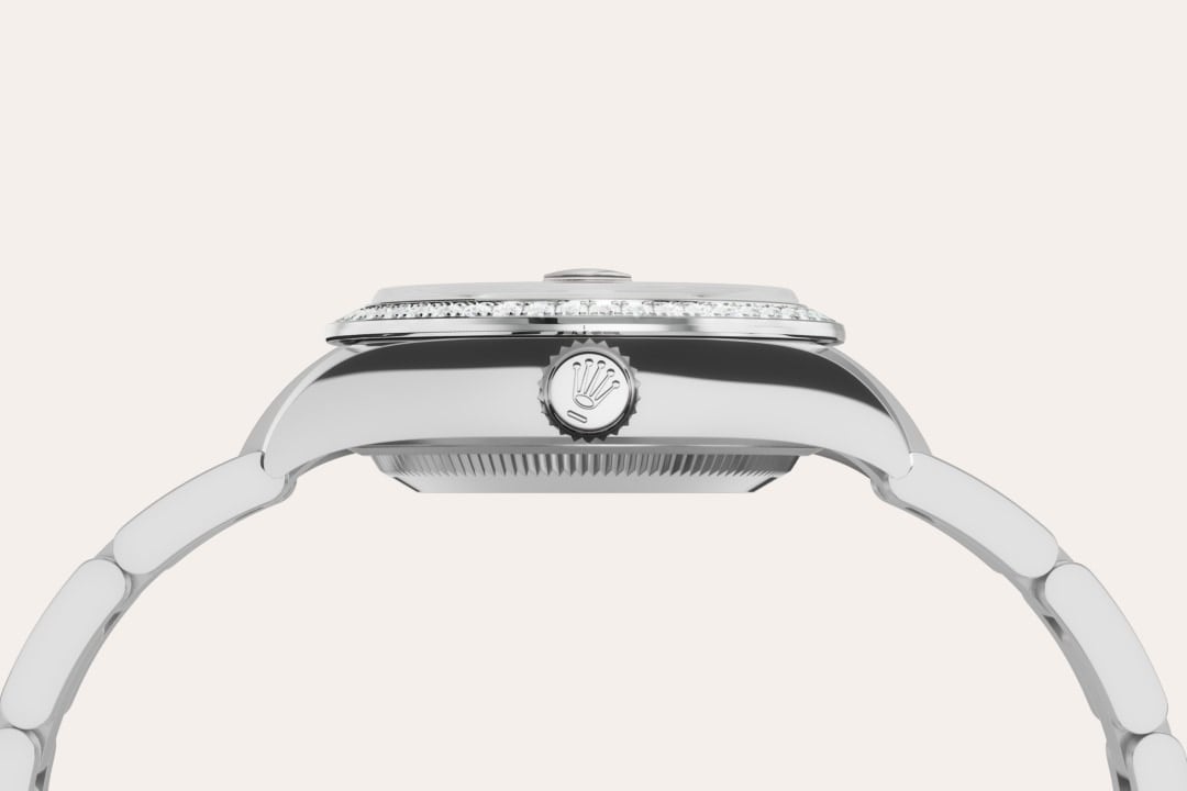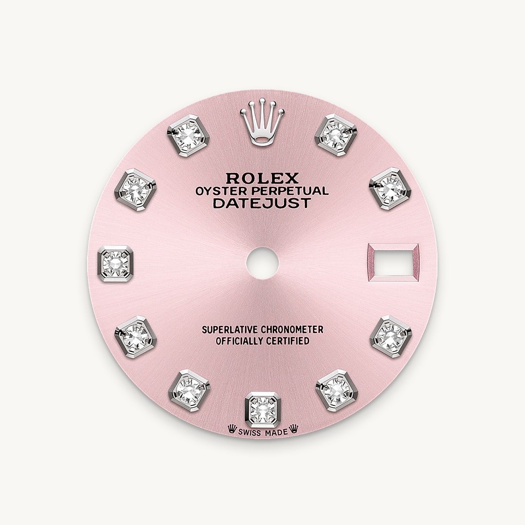 This dial features diamonds in 18 ct gold settings. The sunray finish creates delicate light reflections on many dials in the Oyster Perpetual collection. It is obtained using masterful brushing techniques that create grooves running outwards from the centre of the dial. Light is diffused consistently along each engraving, creating a characteristic subtle glow that moves depending on the position of the wrist. Once the sunray finish has been completed, the dial colour is applied using Physical Vapour Deposition or electroplating. A light coat of varnish gives the dial its final look.