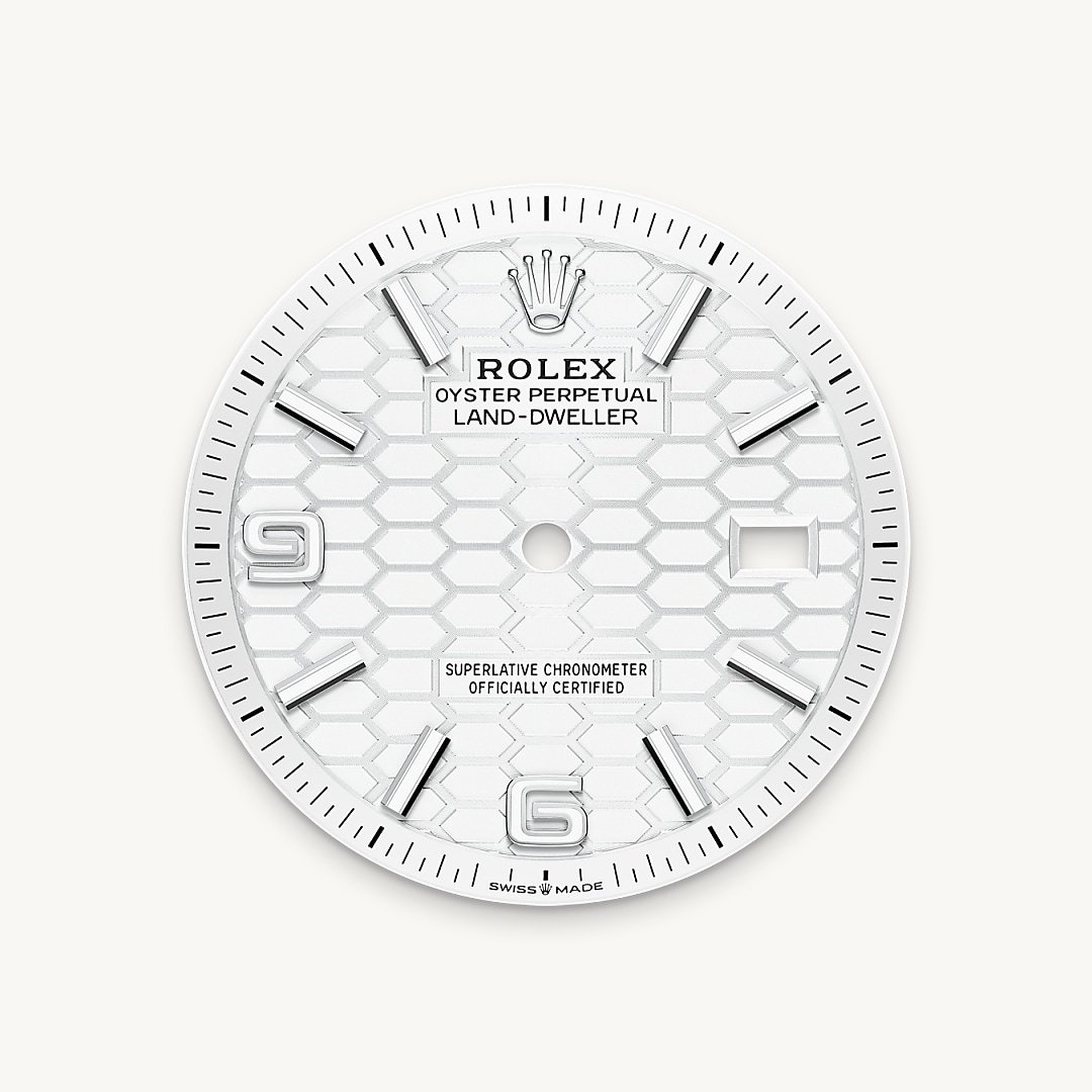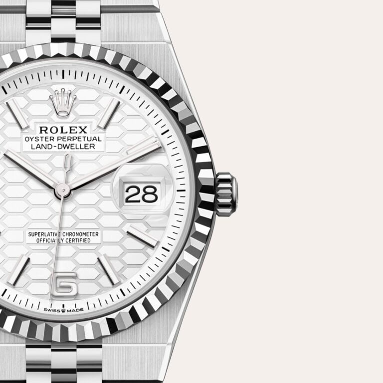 The Rolex fluted bezel is a mark of distinction. Originally, the fluting of the Oyster bezel had a functional purpose: it served to screw the bezel onto the case helping to ensure the waterproofness of the watch. It was therefore identical to the fluting on the case back, which was also screwed onto the case for waterproofness, using specific Rolex tools. Over time, the fluting became an aesthetic element, a genuine Rolex signature feature. Today the fluted bezel is a mark of distinction, in gold on this Land-Dweller 36.
