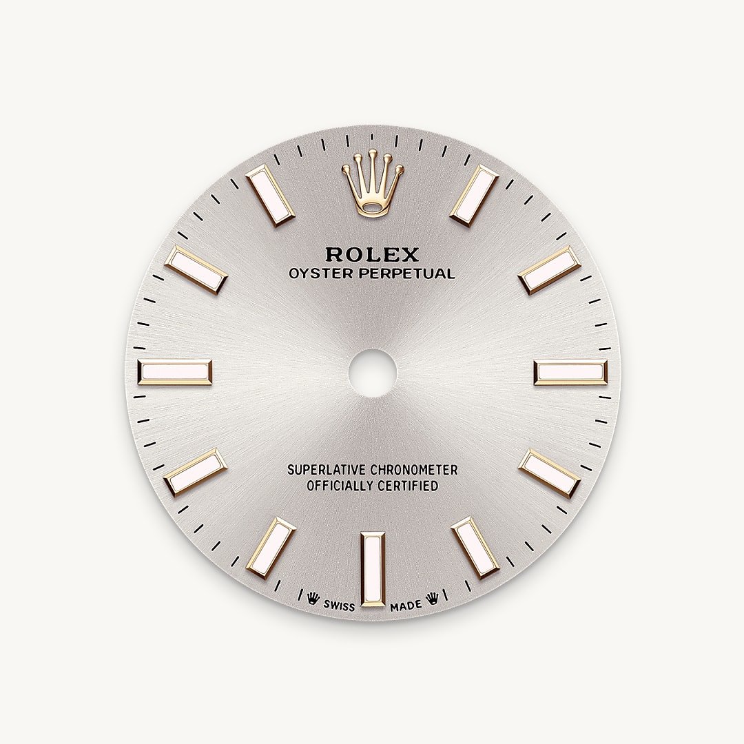 The sunray finish creates delicate light reflections on many dials in the Oyster Perpetual collection. It is obtained using masterful brushing techniques that create grooves running outwards from the centre of the dial. Light is diffused consistently along each engraving, creating a characteristic subtle glow that moves depending on the position of the wrist. Once the sunray finish has been completed, the dial colour is applied using Physical Vapour Deposition or electroplating. A light coat of varnish gives the dial its final look.