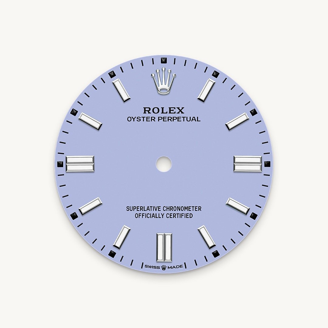 The colours created for the Oyster Perpetual range start life as a lacquer, which must be meticulously applied in a controlled-atmosphere environment to avoid dust and other contamination. The brass plate of the dial base receives layer upon layer of lacquer, six in all, to form a regular, uniform surface. The last step is varnishing and polishing to bring out the full brilliance and depth of colour. The various inscriptions are then pad printed, and the hour markers and crown riveted by hand. The dial, gleaming in its perfection, is all set to take its place on top of the movement at the watch assembly phase.