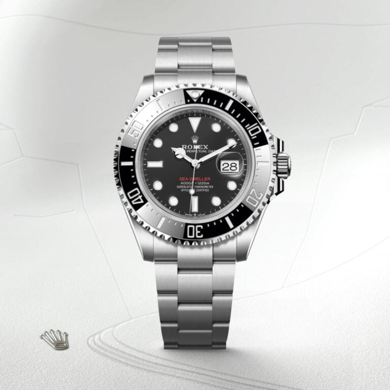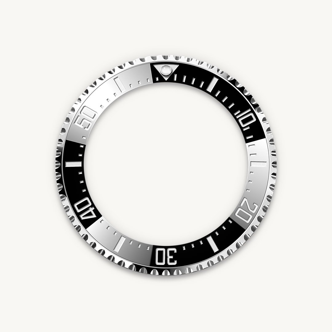 The 60-minute graduated, unidirectional rotatable bezel of the Sea-Dweller enables divers to precisely and safely monitor their dive and decompression times. It is equipped with a patented black Cerachrom bezel insert manufactured by Rolex in a virtually scratchproof ceramic whose colour is unaffected by ultraviolet rays. The graduation is coated via PVD (Physical Vapour Deposition) with a thin layer of platinum. The dial features large Chromalight hour markers and hands, filled with luminescent material that emits a long-lasting blue glow for excellent legibility in dark conditions.