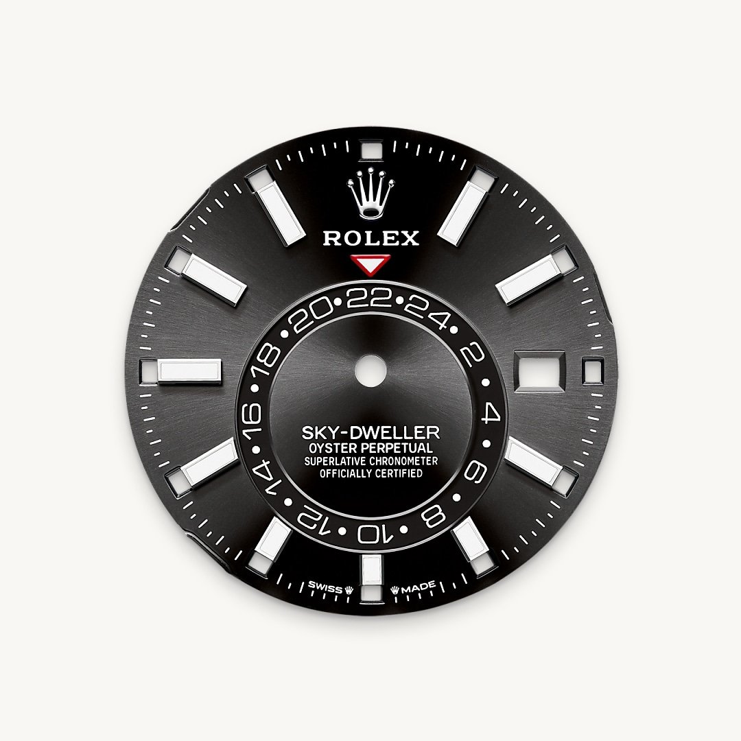 The Sky-Dweller’s new Oysterflex bracelet, developed by Rolex and patented, offers a sporty alternative to metal bracelets. The bracelet attaches to the watch case and the Oysterclasp by a flexible titanium and nickel alloy metal blade. The blade is overmoulded with high-performance black elastomer which is particularly resistant to environmental effects, very durable and perfectly inert for the wearer of the watch. For enhanced comfort, the inside of the Oysterflex bracelet is equipped with a patented longitudinal cushion system that stabilizes the watch on the wrist and fitted with an 18 ct white gold Oysterclasp. It also features the Rolex Glidelock extension system, designed by the brand and patented. This inventive toothed mechanism, integrated beneath the clasp, allows fine adjustment of the bracelet length by some 15 mm in increments of approximately 2.5 mm, without the use of tools.