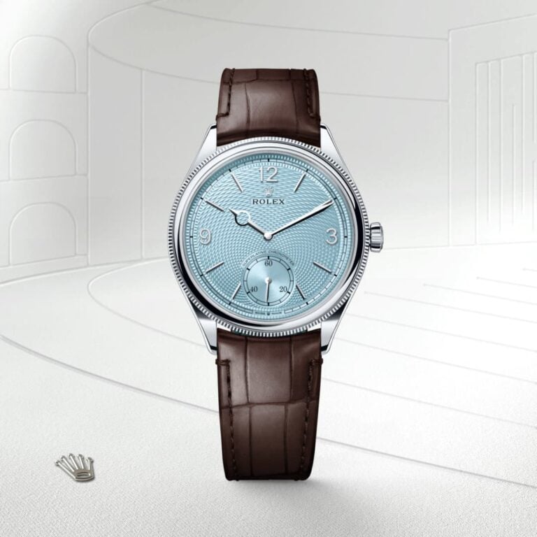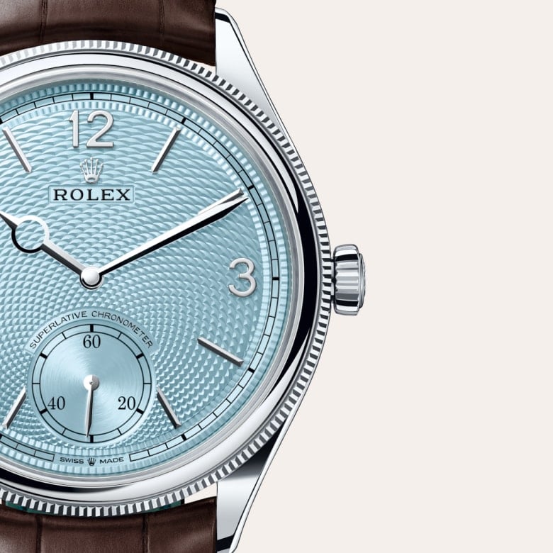 The ice blue dial features a guilloché rice-grain motif. This rosette-like design is distinctive for its three-dimensional, repeating geometric pattern that extends across the surface of the dial starting from the small seconds counter at 6 o’clock. The minute track is surrounded by a filet sauté with crimped pattern, which is also guilloché. With the introduction of a dial created via guillochage, or engine turning – a technique that uses a turning tool to sculpt a pattern into a surface – Rolex is pursuing the course it has set for the Perpetual collection as a tribute to the classic art of watchmaking infused with the brand’s know-how and creativity. This exclusive dial bears the same Arabic numerals 3, 9 and 12, the same faceted hour markers and the same hands as that of the 18 ct gold versions. This exclusive dial colour can be found only on the Day-Date, the Cosmograph Daytona, the Perpetual 1908 and the Land-Dweller.