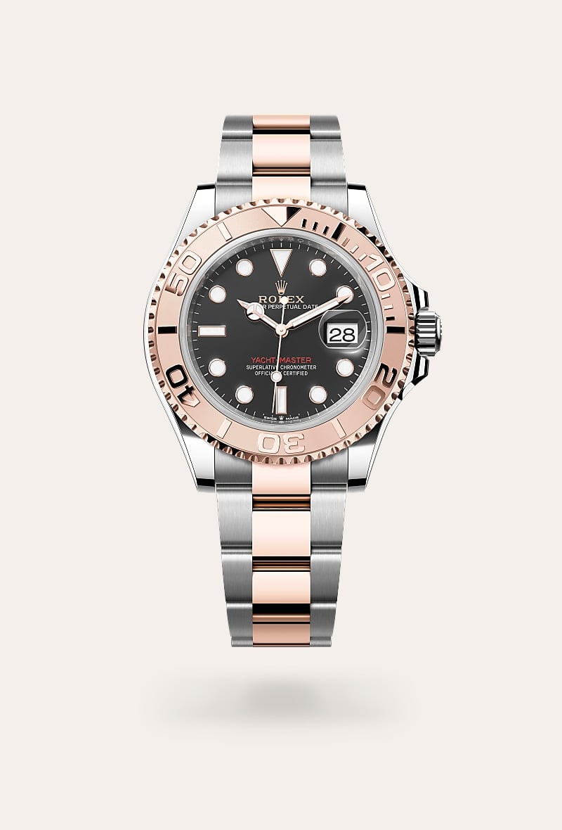 The Yacht-Master 37 and Yacht-Master 40 are available in a Rolesium version (combining Oystersteel and platinum, exclusive to the Yacht-Master range) and in an Everose Rolesor version (combining Oystersteel and Everose gold) with a bezel in precious metal and fitted with an Oyster bracelet. Both models are also offered in 18 ct Everose gold featuring a Cerachrom bezel insert in black ceramic and an Oysterflex bracelet.