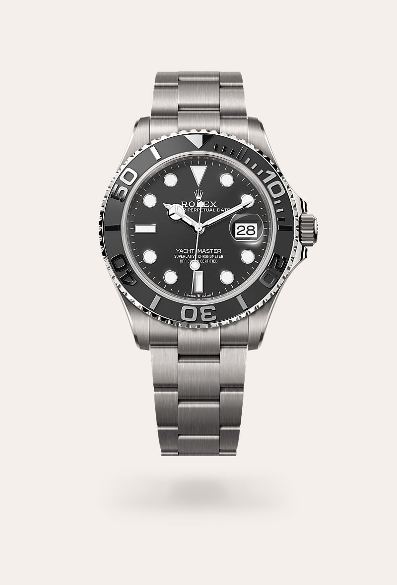 The Yacht-Master 42 is available in 18 ct yellow or white gold with an Oysterflex bracelet and in RLX titanium – a particularly lightweight alloy with excellent corrosion-resistance properties and high mechanical strength – with an Oyster bracelet. This version, unveiled in 2023, stands out for its technical satin finish, a finish with a visible grain.