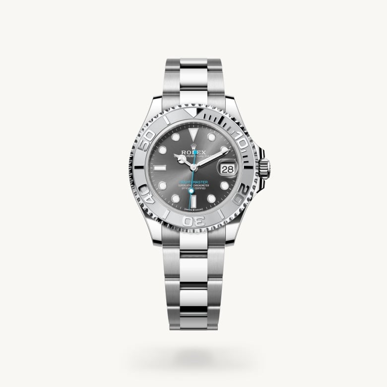 Many Rolex watches are available with the now-legendary combination of yellow, white or Everose gold and steel known as Rolesor, but Rolesium is a creation specific to the Yacht-Master. While the case and bracelet are in rugged Oystersteel, the bezel of the Rolesium versions is made of platinum, imparting a silvery whiteness and vibrant luminosity for an unmistakable sense of luxury.